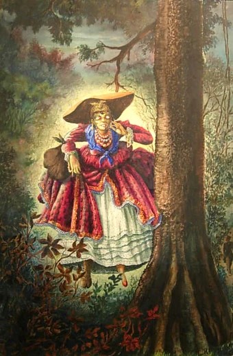 She is dressed exquisitely in a blouse with puffy sleeves and long petticoated skirts. La diablesse a la diablesse lajables the devil woman.